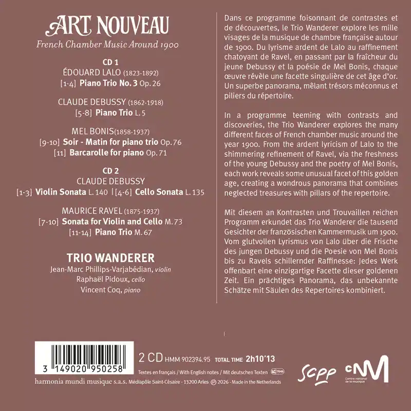 In een programma vol contrasten en ontdekkingen verkent Trio Wanderer de vele verschillende facetten van de Franse kamermuziek rond de eeuwwisseling van 1900. Van de gepassioneerde lyriek van Lalo tot de frisse roekeloosheid van de jonge Debussy en van de poëzie van Mel Bonis tot de duizelingwekkende verfijning van Ravel, elk werk onthult een ongewoon facet van deze gouden eeuw, waardoor een wonderlijk panorama ontstaat dat vergeten schatten combineert met de pijlers van het repertoire.