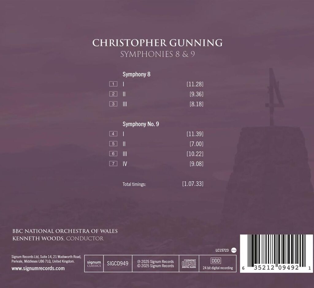 De viervoudig BAFTA-winnende componist Christopher Gunning heeft twaalf symfonieën gecomponeerd, evenals concerten voor piano, viool, cello, fluit, hobo, klarinet, saxofoon en gitaar. Hier spelen het BBC National Orchestra of Wales en dirigent Kenneth Woods zijn achtste en negende symfonie, opgenomen in Hoddinott Hall in maart 2024. “Elk stuk is gecomponeerd voor een middelgroot orkest (de achtste heeft slechts één trompet en geen lagere koperblazers, terwijl de negende een tweede trompet, een harp en een kleine slagwerksectie toevoegt) en beide [grappen], op Gunnings zeer individuele manier, met de erfenis van de klassieke symfonische vorm” – Richard Bratby. [9e symfonie] “Ik geloof dat dit stuk een sterke emotionele lading heeft, maar als je probeert het verhaal te ontwarren, kom je uiteindelijk uit bij je eigen verhaal – en voor mij is dat absoluut perfect.” – Christopher Gunning. “Gunnings […] symfonieën, talrijke concerten en diverse orkestrale stukken zijn even zorgvuldig vervaardigd als krachtig bedacht.” – Gramophone