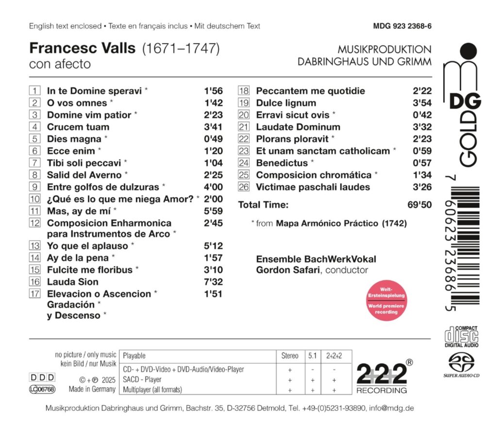 vurig – Wanhopige beledigingen zijn geen uitvinding van onze tijd: Francesc Valls – die bijna gelijktijdig met Bach leefde – kreeg ze te verduren aan het begin van de 18e eeuw: Er zijn zo’n 80 artikelen bewaard gebleven over de controversia de Valls, die werd uitgelokt door brutale dissonanten in zijn Missa scala aretina. In de nieuwste opname met zijn BachWerkVokal laat Gordon Safari horen dat Valls veel verder kon gaan. Je luistert en staat steeds weer versteld: de Catalaan schuwde zelfs kwarttonen niet..