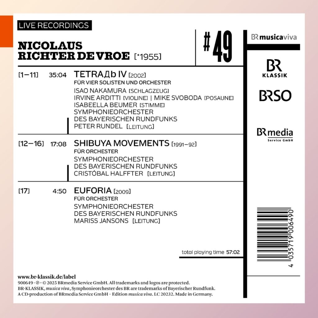 De werken van violist en componist Nicolaus Richter de Vroe (*1955) zijn regelmatig uitgevoerd door de meest gerenommeerde organisatoren en festivals van hedendaagse muziek. De musicus begon zijn opleiding aan de Speciale Muziekschool in Dresden, nu de Saksische Staatsschool voor Muziek Carl Maria von Weber. Na zijn vioolstudie aan het Tsjaikovski Conservatorium in Moskou was hij actief in verschillende kamermuziek-, improvisatie- en experimentele ensembles. in 1980 werd hij lid van de Staatskapelle Berlin en voltooide hij zijn compositiestudie bij Friedrich Goldmann en Georg Katzer aan de Kunstacademie van de DDR. in 1982 richtte hij het Ensemble für Neue Musik Berlin (Ost) op, dat al snel uitgroeide tot een belangrijk forum voor geavanceerde muziek in de DDR. Sinds het midden van de jaren 1980 is Richter de Vroe aanwezig met uitvoeringen van zijn werken en als performer op alle ARD radiostations en op internationale festivals. in 1988 werd hij lid van het Beierse Radio Symfonie Orkest; een jaar later richtte hij het XSEMBLE München op – een ensemble dat zich kenmerkt door experimentele programmering en stilistische openheid. in 1996 was hij medeoprichter van de Münchener Gesellschaft für Neue Musik, die zich inzet voor de promotie van hedendaagse muziek. Naast zijn werk als componist en uitvoerder is Richter de Vroe sinds 1994 regelmatig te gast aan Goethe Instituten over de hele wereld, waar hij lezingen, portretconcerten en presentaties van zijn werk geeft. In 2008 werd hij toegelaten tot de Saksische Kunstacademie. Richter de Vroe’s compositie TETRAДb IV voor vier solisten en orkest werd in 2002 geschreven in opdracht van musica viva van de Bayerischer Rundfunk. De wereldpremière op deze cd door Isao Nakamura (percussie), Irvine Arditti (viool), Mike Svoboda (trombone) en Isabeella Beumer (zang) en het Beierse Radio Symfonie Orkest onder leiding van Peter Rundel vond plaats op 15 november 2002 in de Herkulessaal van de Residenz in München. – Hoewel het grote orkest wordt bijgestaan door vier solisten, is het werk geen concerto of concerto grosso. De solopartijen zijn zo verschillend dat ze nauwelijks met elkaar kunnen wedijveren tijdens een concert. Ze verschijnen ook na elkaar; elk kenmerkt een langer deel van het werk met zijn specifieke dictie en pas tegen het einde zijn ze samen te horen. De solo van de vocalist is gebaseerd op een gedicht van de experimentele Russische dichter Daniil Charms. Richter de Vroe’s artistieke affiniteit met Charms’ gedachtegoed komt tot uitdrukking in de titel TETRAДb IV – het Russische woord “Tetra”, waarvan alleen de laatste letter in het cyrillisch wordt geschreven, betekent “boekje” – en in de experimentele benadering van zijn tekst. Shibuya Movements voor orkest was ook een opdracht van musica viva van de Bayerischer Rundfunk in 1991 / 92. Deze CD biedt een opname van de wereldpremière op 15 mei 1992 door het Beierse Radio Symfonie Orkest onder leiding van Cristóbal Halffter in de Herkulessaal van de Residenz in München. Euforia voor orkest werd gecomponeerd in 2009; de wereldpremière op 31 oktober 2009 door het Beierse Radio Symfonie Orkest onder leiding van Mariss Jansons vond ook plaats in de Herkulessaal van de Munchen Residenz.
