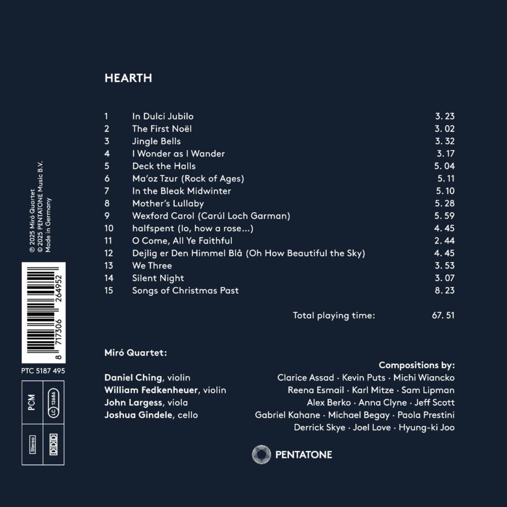 Het Miró Quartet nodigt u uit om samen te komen rond de warmte van het feestelijke haardvuur – een diep persoonlijk en vreugdevol album dat de geest van de feestdagen viert door de stemmen van de meest intrigerende componisten van vandaag. Of het nu Kerstmis, Chanoeka, Kwanzaa of gewoon rustige contemplatie bij het haardvuur is, dit album vangt de essentie van de feestdagen als een tijd van verbinding, herinnering en hoop.