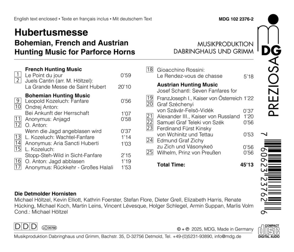 verbazingwekkend – Dit is iets heel bijzonders: In de serie “Preziosa” presenteert MDG de Hubertusmis, een van de allereerste opnamen van het label Detmold met de onvergetelijke Michael Höltzel als oprichter, leraar en directeur van de hoornblazers uit Detmold. De uitmuntende tonale, technische en bovenal muzikale kwaliteit en het extra opgenomen historische geluidsmateriaal bewijzen de consistentie waarmee MDG sindsdien muziekliefhebbers en klankliefhebbers over de hele wereld in verrukking brengt.