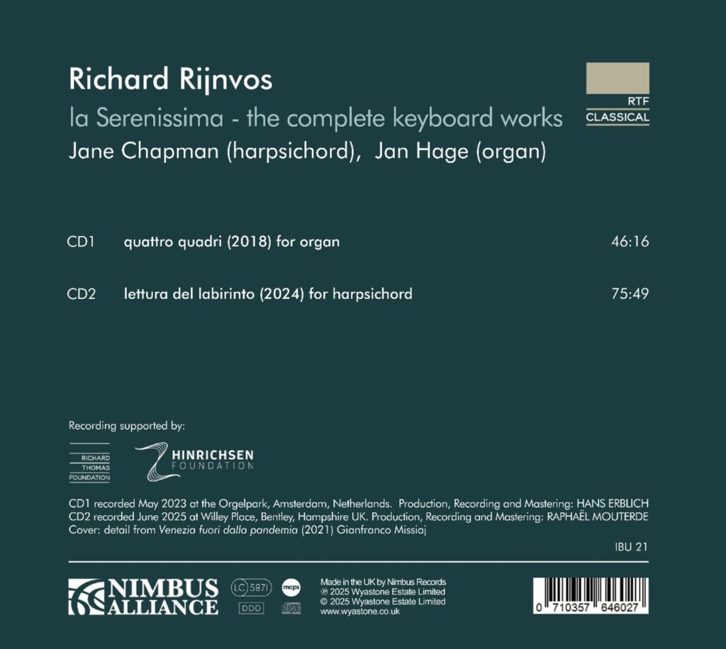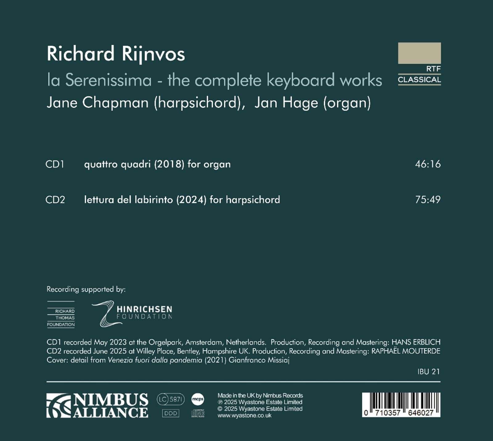 In 2001 begon Richard Rijnvos aan een serie composities gewijd aan de stad Venetië onder de titel “la Serenissima”. Deze meerjarige work-in-progress omvat momenteel zeven composities, waarvan de twee meest recente het onderwerp zijn van deze opname. Jan Hage is vooral bekend als voorvechter en veelgevraagd vertolker van hedendaagse orgelmuziek. In 2006 ontving hij de zilveren medaille van de Societe Academique Arts Sciences Lettres in Parijs voor zijn verdiensten voor de Franse orgelcultuur. Jane Chapman is een van de meest gerenommeerde klassieke klavecinisten van Groot-Brittannië. Haar repertoire varieert van oude muziek tot de hedendaagse avant-garde. Omschreven door The Independent on Sunday als ‘Britain’s most progressive clavecichordist’ en door The Guardian als een ‘fearless interpreter of contemporary music’, is ze gepassioneerd over het creëren van nieuwe muziek voor het klavecimbel.