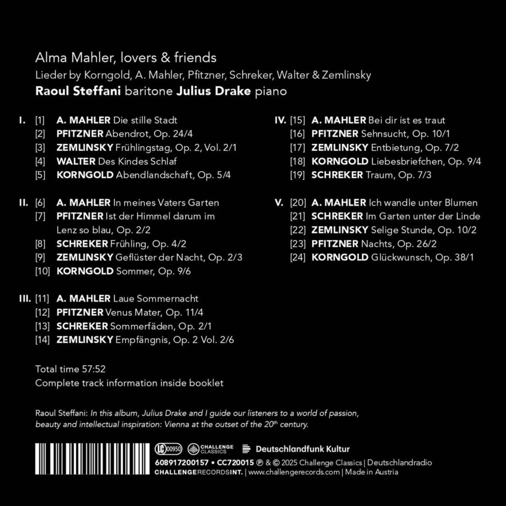 In dit album nemen Alma Mahler, geliefden en vrienden, Julius Drake en ik onze luisteraars mee naar een wereld van passie, schoonheid en intellectuele inspiratie: Wenen aan het begin van de 20e eeuw. Een tijdperk van grote welvaart en ongekende artistieke bloei, waarin muziek, literatuur en beeldende kunst op een unieke manier samensmolten. In deze bruisende culturele omgeving was Alma Mahler een muze en een jonge componist in het centrum van een aantal invloedrijke bewegingen. De diepgevoelde emoties, esthetische verfijning en innerlijke onrust die deze periode kenmerkten zijn terug te horen in haar eigen muziek en die van de componisten in haar omgeving, op dit album vertegenwoordigd door Erich Wolfgang Korngold, Hans Pfitzner, Franz Schreker, Bruno Walter en Alexander Zemlinsky.