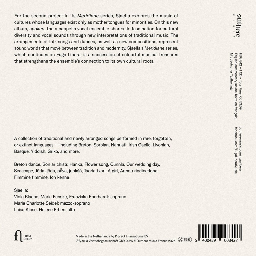 Voor het tweede project in de Meridiane- serie onderzoekt Sjaella de muziek van culturen waarvan de taal alleen als moedertaal voor minderheden bestaat. Op dit nieuwe album, Spoke , deelt het a capella vocale ensemble haar fascinatie voor culturele diversiteit en vocale klanken door middel van nieuwe interpretaties van traditionele muziek. De arrangementen van volksliederen en dansen, evenals nieuwe composities, vertegenwoordigen klankwerelden die zich bewegen tussen traditie en moderniteit. Sjaella’s Meridiane- serie, die wordt voortgezet op Fuga Libera, is een aaneenschakeling van kleurrijke muzikale schatten die de band van het ensemble met de eigen culturele wortels versterkt.