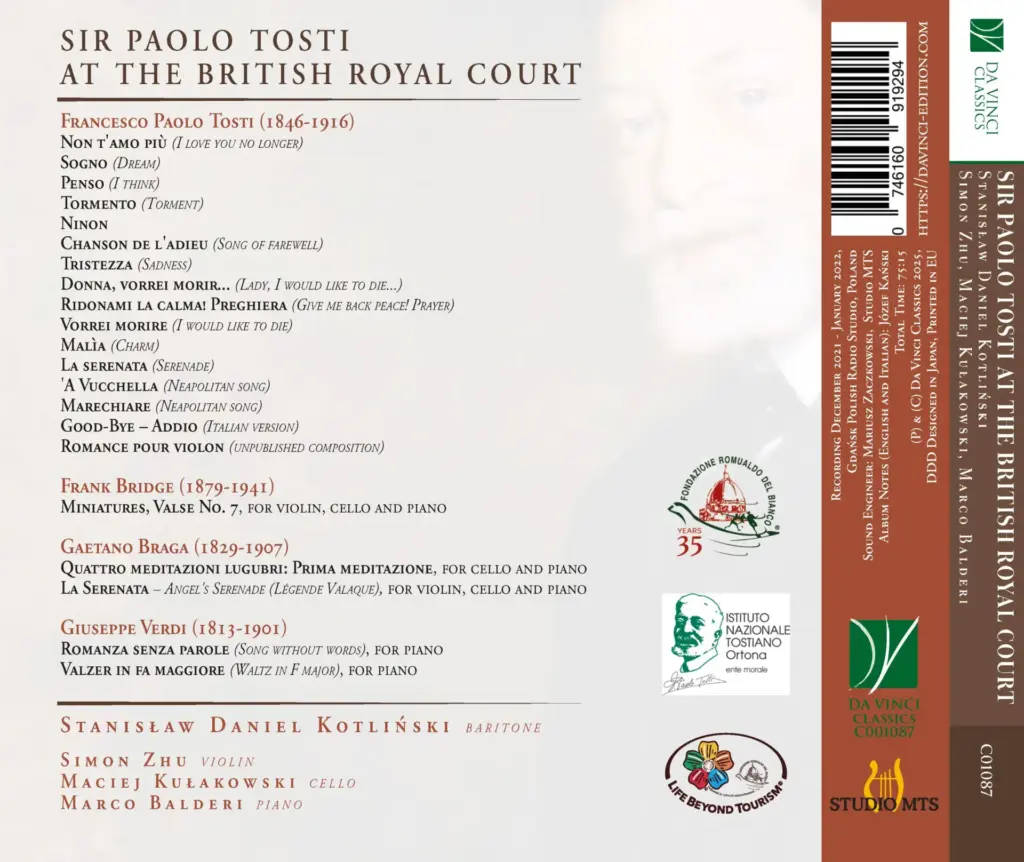 In 2021 was het 175 jaar geleden dat een van de meest briljante componisten van Italië werd geboren – Sir Paolo Tosti – een vernieuwer en moderniseerder van de Italiaanse stijl van kamermuziek. De festiviteiten culmineerden in een feestelijk concert, gehouden onder het patronage van het Istituto Nazionale Tostiano en getiteld Gran Galà Tosti. Dit concert vond plaats in december 2021 in het Teatro Tosti in Ortona, de geboorteplaats van de componist. De hoofdartiest van de avond was de vooraanstaande Poolse basbariton Stanisław Daniel Kotliński, die al jarenlang fungeert als een “cultureel ambassadeur” voor Tosti’s werk en het met passie over de hele wereld uitvoert. Hij werd bij deze gelegenheid vergezeld door de Italiaanse dirigent en pianist Marco Balderi en twee jonge prijswinnaars van internationale strijkerswedstrijden: de Duitse violist van Chinese afkomst Simon Zhu en de Poolse cellist Maciej Kułakowski. Dezelfde musici zijn te horen op deze opname, gemaakt in de Poolse radiostudio’s in Gdansk.