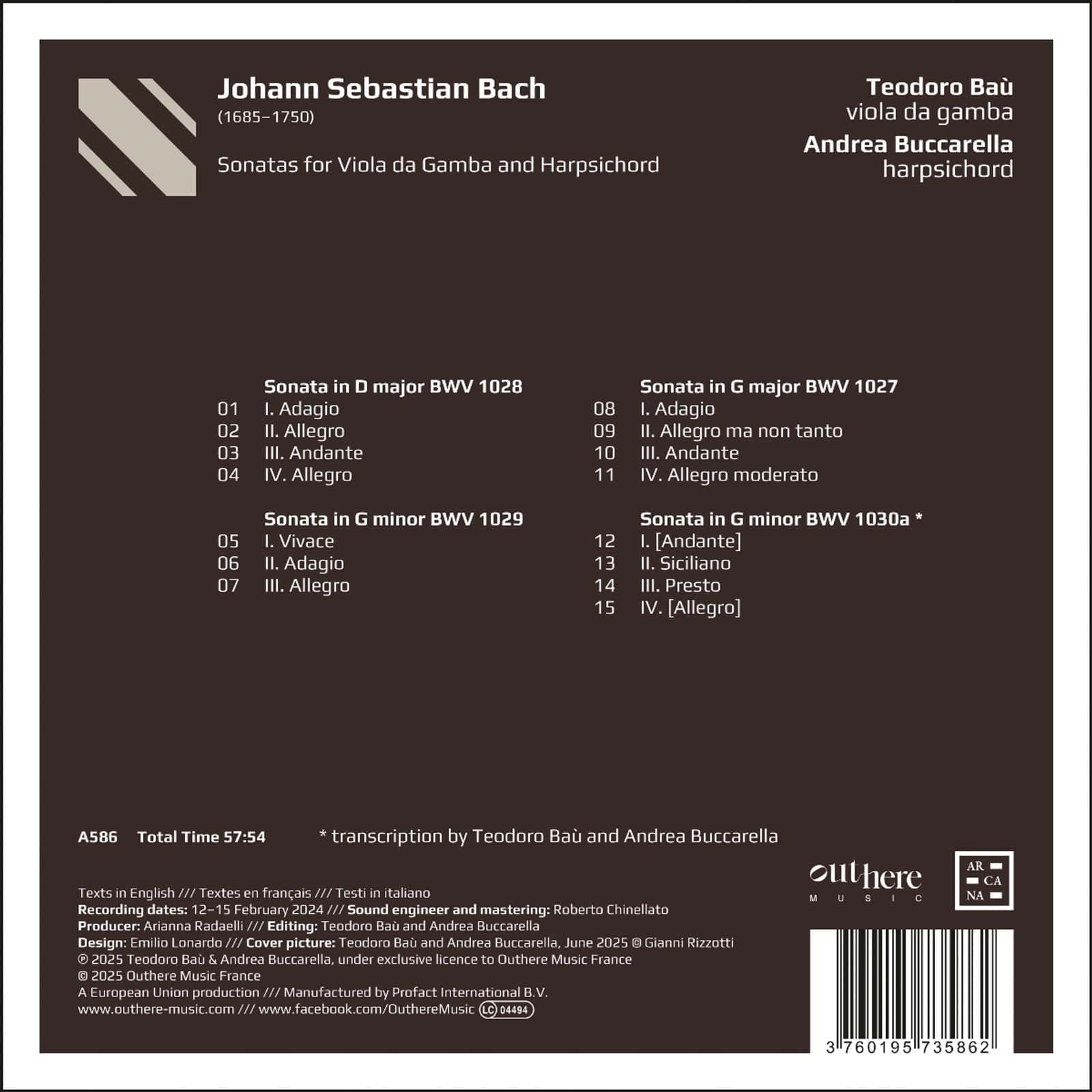Johann Sebastian Bach, hoewel grotendeels onaangedaan door de trends van zijn tijd, herinterpreteerde veel oudere vormen met opvallende originaliteit en bepaalde zo de koers van de westerse muziek. Tot zijn innovaties behoort de sonate voor een melodie-instrument (zoals de viola da gamba) en een obligaat klavecimbel, waarbij beide partijen een gelijkwaardige dialoog aangaan – een model dat later werd uitgebreid door zijn zonen en componisten zoals Haydn, Mozart en Beethoven. Na hun veelgeprezen debuutalbum gewijd aan Corelli’s Sonates Op. 5 presenteren Teodoro Baù en Andrea Buccarella nu hun tweede duo-opname: de Sonates voor viola da gamba en klavecimbel van J.S. Bach, die elk een unieke stilistische benadering binnen een uniforme vorm onthullen.