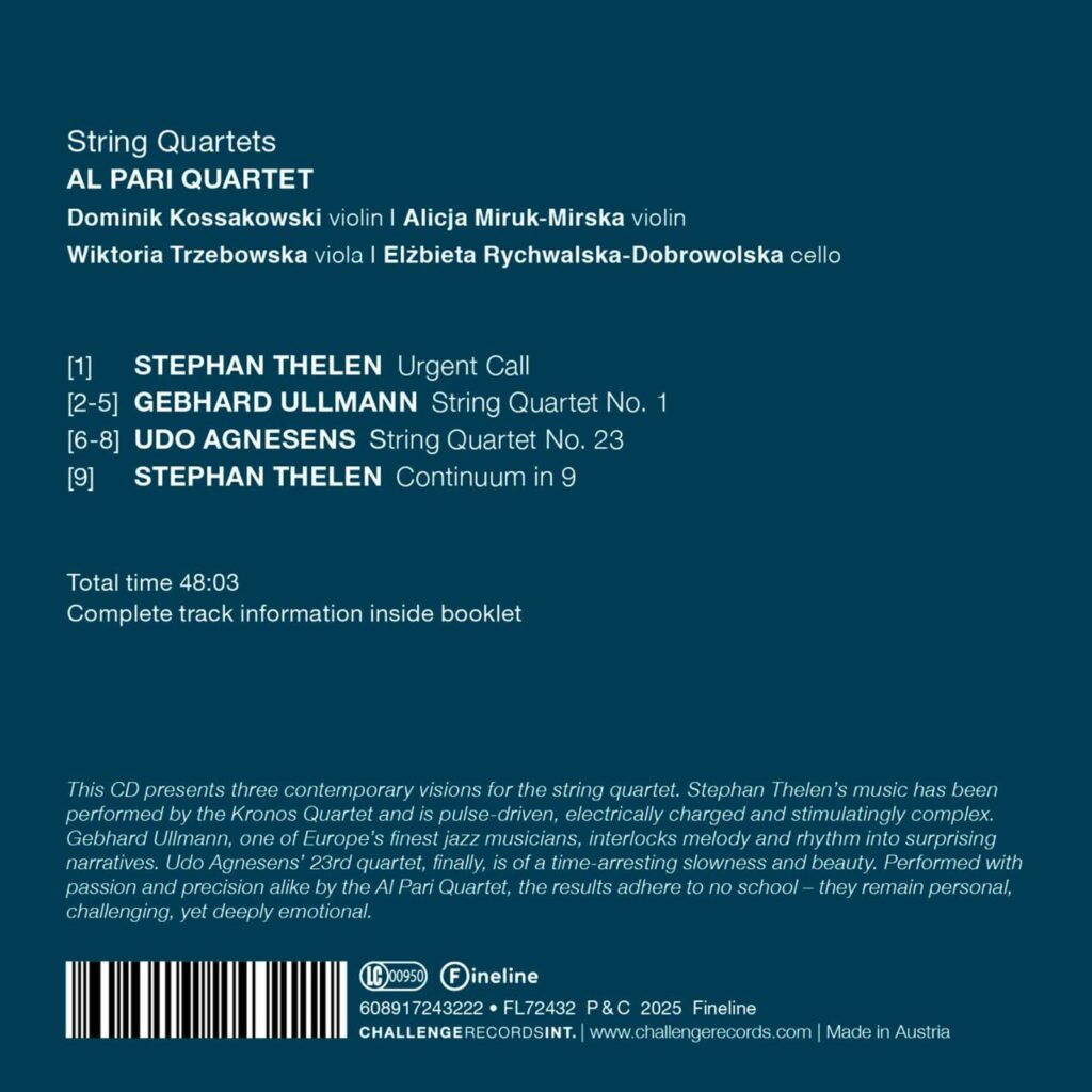 Sonische dialoog over grenzen en disciplines. String Quartets brengt drie visionaire componisten – Stephan Thelen, Gebhard Ullmann en Udo Agnesens – samen in een boeiende verkenning van hedendaagse strijkkwartetcomposities. Uitgevoerd met indrukwekkende intensiteit en nuance door het Al Pari Quartet, omvat dit album een landschap van sonische texturen, ritmische complexiteit en diep persoonlijke expressie. De componisten en werken: Stephan Thelen draagt twee krachtige stukken bij – “Urgent Call” en “Continuum in 9” – die een brug slaan tussen minimalistische structuur en progressieve rockenergie. Voortbordurend op zijn achtergrond als wiskundige en oprichter van de band Sonar, wordt de muziek van Thelen gekenmerkt door polyritmische gelaagdheid en wiskundige precisie zonder zijn bijna viscerale emotionele kracht te verliezen. “Urgent Call” is een stuwende evocatie van Thelens sonische idealen, terwijl “Continuum in 9” knisperende texturen versmelt met elektrische urgentie, waardoor de grenzen tussen concertzaal en rockpodium vervagen. Gebhard Ullmanns String Quartet No. 1 ontvouwt zich als een meditatieve, melodieuze reis door delen die sprankelen van emotionele helderheid. Als vooraanstaand jazzsaxofonist en klarinettist wendt Ullmann zich tot compositie als een ruimte voor reflectie. Zijn kwartet begint met etherische sul-tasto texturen en ontwikkelt zich tot complexe interrelaties tussen melodie, herinnering en transformatie. Geïnspireerd door thema’s uit zijn eigen creatieve archief, resoneert Ullmanns muziek met een gevoel van vergankelijkheid en transcendentie. Udo Agnesens, vertegenwoordigd door zijn Strijkkwartet nr. 23, levert de meest introspectieve bijdrage. Hoewel Agnesens een productieve componist is met meer dan 30 kwartetten op zijn naam, schrijft hij vaak zonder zich te richten op uitvoering – zijn focus ligt meer op creatie dan op verspreiding. Het 23e kwartet wordt gekenmerkt door een plechtig tempo en emotionele diepte en vraagt een enorme beheersing van de uitvoerenden. Het betovert de luisteraar en onthult zijn subtiele schoonheid door geduld en terughoudendheid. “Als je geen tijd hebt om echt naar de muziek te luisteren,” zegt hij, “moet je misschien iets anders gaan doen.” Het Al Pari Kwartet. Het Al Pari Quartet – Dominik Kossakowski (viool), Alicja Miruk-Mirska (viool), Wiktoria Trzebowska (altviool) en Elżbieta Rychwalska-Dobrowolska (cello) – werd in 2017 opgericht door studenten van de Karol Szymanowski Academy of Music in Katowice en is uitgegroeid tot een geduchte kracht in de hedendaagse kamermuziek. Hun werk op deze opname getuigt niet alleen van technisch meesterschap, maar ook van een diepgaand interpretatief inzicht. Ze presenteren elke compositie met helderheid, warmte en expressieve gevoeligheid en slaan een brug tussen de complexe ritmische structuren en emotionele eisen van elk stuk.
