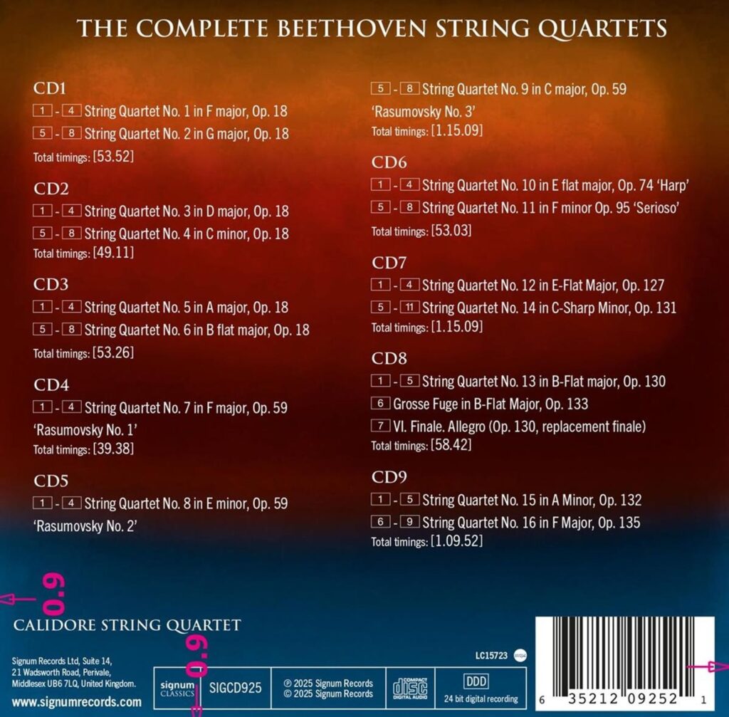 Om 2025 af te sluiten presenteert het gevierde Calidore Quartet hun complete Beethoven-boxset, met al zijn 16 strijkkwartetten. Het album van het Late Quartet won in 2023 de BBC Music Magazine Chamber Award, de Middle Quartets kregen in 2024 de Opname van de Maand (oktober) van Gramophone, en de laatste ‘Early’ Quartets kregen 4-sterrenrecensies.