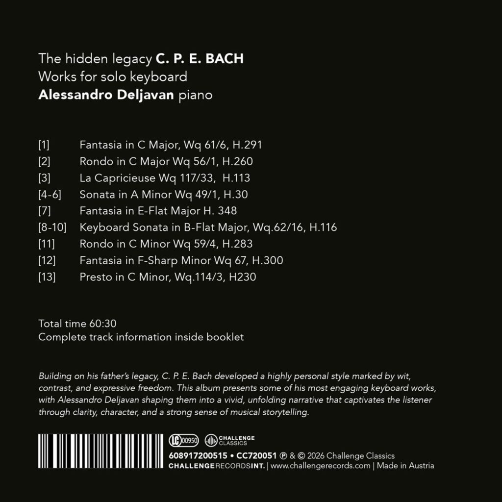 In The Hidden Legacy verkent de Italiaanse pianist Alessandro Deljavan de rusteloze verbeelding en expressieve durf van Carl Philipp Emanuel Bach (1714-1788), een componist die een brug sloeg tussen de complexiteit van de barok en de klassieke helderheid. Het programma doorkruist het uitgestrekte emotionele en stilistische landschap van de klavierwerken van C.P.E. Bach – van de introspectieve fantasieën en vurige rondo’s tot de meer delicate sonates – en onthult de baanbrekende toewijding van de componist aan Empfindsamkeit, die “gevoelige stijl” die tot doel had menselijke emoties in al hun veranderlijkheid te weerspiegelen. Deljavans interpretaties belichten de dramatische contrasten en psychologische diepgang van deze muziek en transformeren elk stuk in een levendig, onvoorspelbaar verhaal dat vandaag de dag nog net zo levendig is als twee eeuwen geleden. Deljavans kunst combineert intellectuele precisie met onverschrokken emotionele spontaniteit. Zijn frasering, timing en gebruik van stilte verheffen Bachs kwikzilveren geest tot een direct, diep menselijk niveau. De opname is niet alleen een historisch eerbetoon, maar ook een levendige dialoog tussen componist en uitvoerder – een meditatie over creativiteit, vrijheid en gevoel. Met dit album zet Deljavan zijn levenslange missie voort om “het hart te raken” en de spanning, tederheid en transcendentie vast te leggen die de nalatenschap van C.P.E. Bach zowel verborgen als onmisbaar maken.
