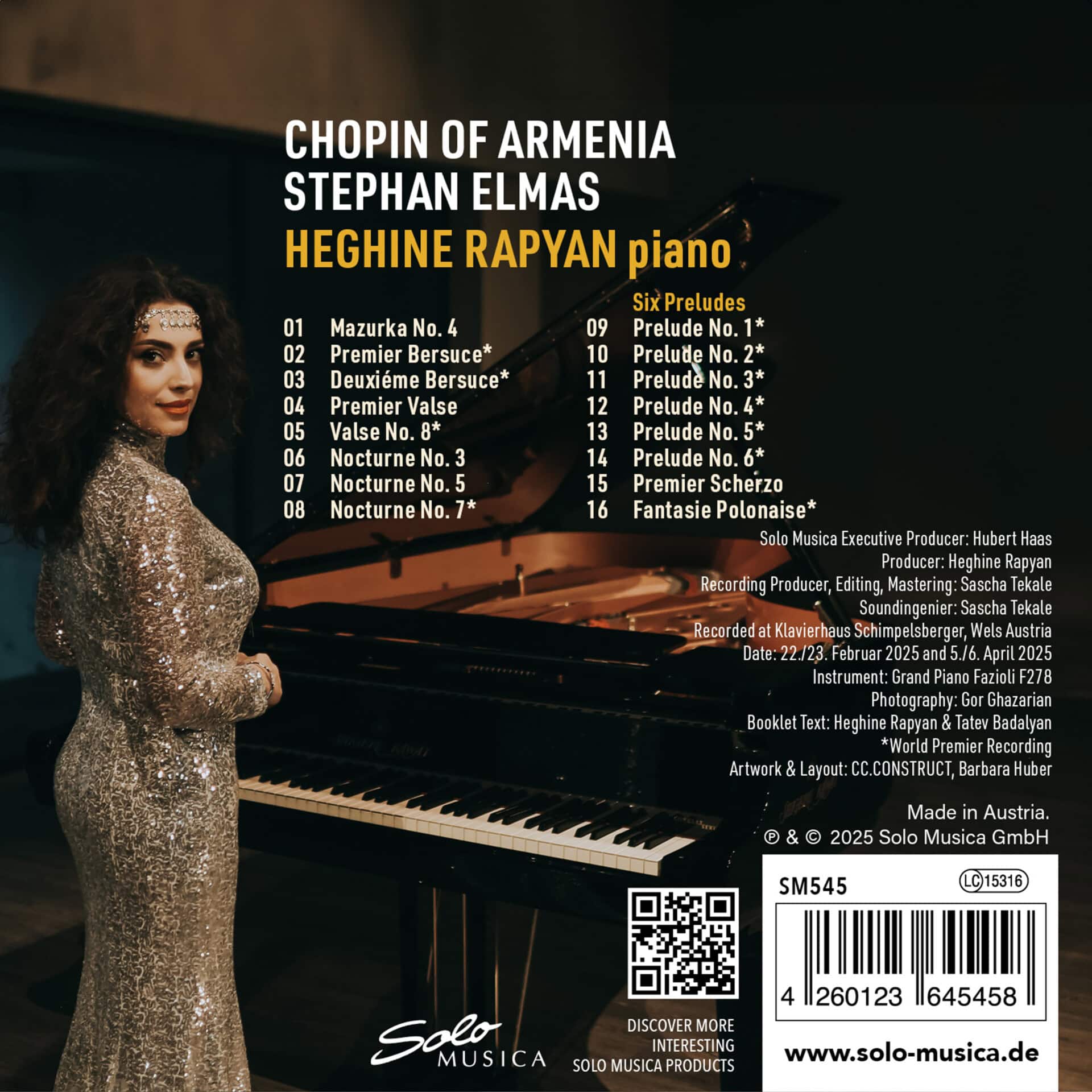 Wie beter dan Heghine Rapyan kon deze opname verzorgen? Als getalenteerde pianiste en als volksgenote van Elmas, kan ze zich bijzonder goed inleven in de werken. Chopin is haar ook niet vreemd en zo kom je tot een zeer aaibare uitvoering die je vanaf de eerste tot de laatste noot ononderbroken wil beluisteren. Het is heerlijk, dromerig, o zo romantisch, soms wat stroperig maar net niet teveel, soms ook vol zware ernst, wat droefheid en geladen. Rapyan laat al die rijkdom vloeien in de mooiste klanken die een piano kan weergeven. Geniet van deze opname!