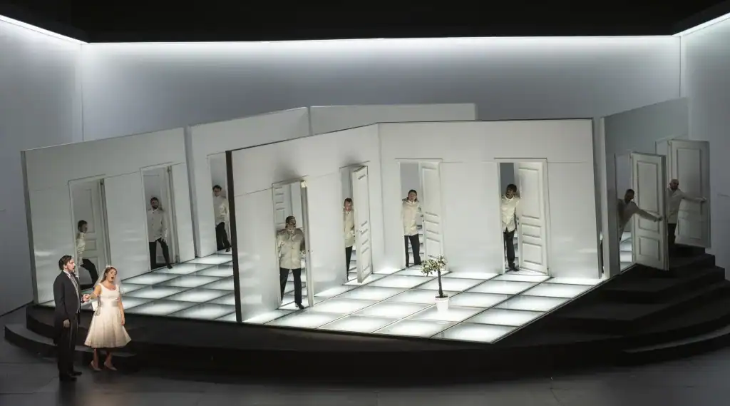 Damiano Michieletto interpreteert Il Cappello di paglia di Firenze terecht als een “folle journée” à la Nozze di Figaro van Mozart. Hij zorgt in zijn regie voor verrassing en vaart en het decor is daar perfect aan aangepast. Het verhaal is op zich kleurrijk genoeg om het kraak witte decor te verdragen. Belangrijkste kenmerk is de wendbaarheid en beweeglijkheid van de wanden en de vele deuren. Soms neemt het stuk de stijl van een deurenkomedie aan. De personages gedragen zich zeer vlot en levendig. Hoe verscheurd Fadinard bij sommige gebeurtenissen ook is, hij verliest er de moed niet bij en blijft een naïeve hoop koesteren dat hij met het kleine restje van de hoed, uiteindelijk de juiste strooien hoed “van Firenze”! zal vinden.