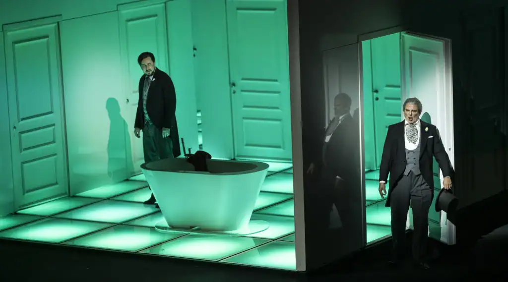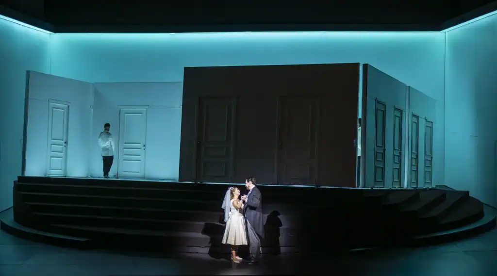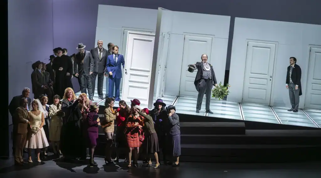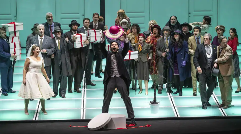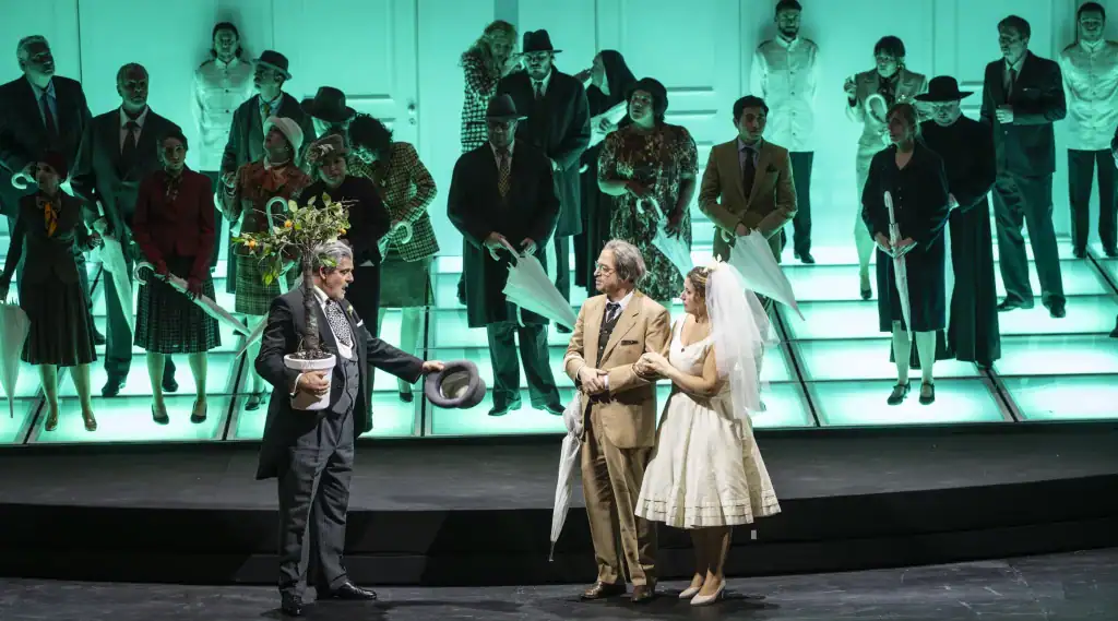 We kennen Michieletto als een meester van de komedie op de operascène en ook hier slaagt hij erin de personages hun dwaasheid als echt te laten beleven en de stupiede details (de oranjeboom die als symbool van huwelijksliefde meegaat van scène naar scène, de te kleine schoenen, de soldaten) aanvaardbaar komisch te laten overkomen en nooit als ongeloofwaardig ridicuul. De zangers dragen zeker bij tot het slagen van het geheel: het is een totale equipe die zowel de zangpartijen als het acteren met verve en in de juiste stijl realiseert. Misschien heeft Pietro Spagnoli als schoonvader de juiste “spirit” in de cast doen ontspringen. De jonge dirigent Leonardo Sini voelt zich thuis in de vlotte en kleurrijke partituur en legt de ironische accenten fijntjes in de zanglijnen waar het over “Firenze” gaat. Een subtiele verwijzing van Nino Rota naar Puccini’s Gianni Schicchi ?
